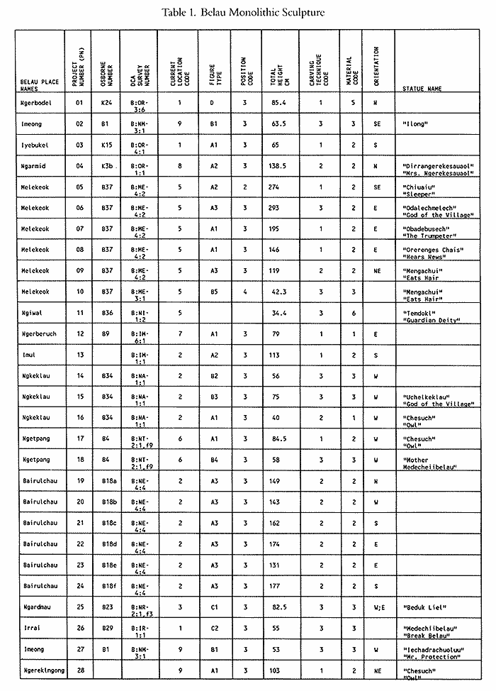 Table listing twenty-eight stone monoliths recorded during our 1987 fieldwork in Belau, Micronesia. Project number 27 was said to resemble Easter Island sculpture.